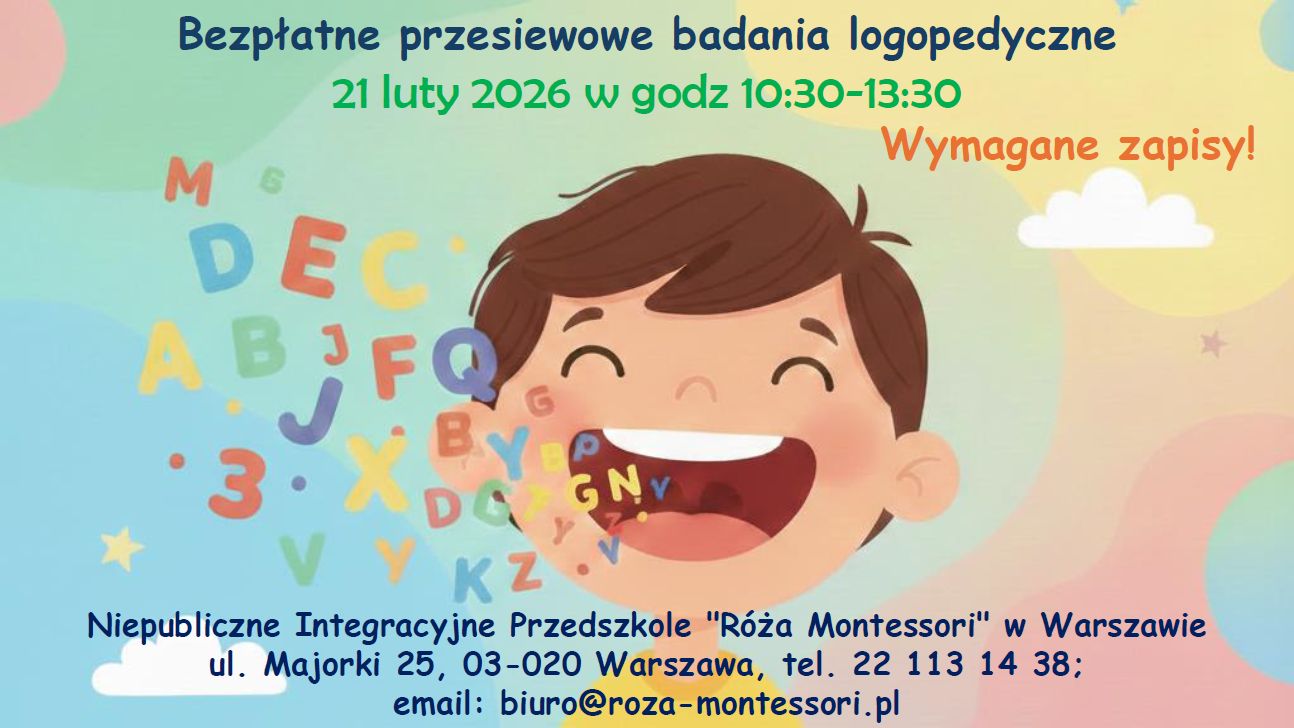 Zapraszamy serdecznie na bezpłatne logopedyczne badania przesiewowe dla dzieci w wieku 2-6 lat. Badania odbędą się 21 lutego br. w godz. 10.30-13.30 w Niepublicznym Integracyjnym Przedszkolu Róża Montessori, przy ul. Majorki 25 w Warszawie. Obowiązują zapisy. Zainteresowanych rodziców prosimy o wypełnienie poniższej ankiety zgłoszeniowej. Po jej wypełnieniu otrzymają Państwo informację z potwierdzeniem dokładnej godziny badania. Więcej informacji można uzyskać dzwoniąc pod nr tel. 22 1131438 w. 1, 604214257, lub pisząc na adres: biuro@roza-montessori.pl. Zapraszamy! Liczba miejsc ograniczona.